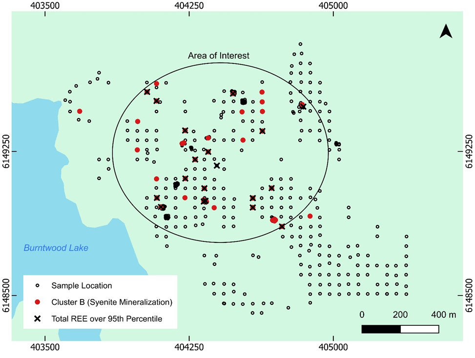 Integral applied principal component analysis (PCA) and K-means clustering to reduce complexity and isolate patterns indicative of mineralization. This multivariate approach identified a distinct geochemical cluster of samples (Cluster B – Syenite Mineralization) with elevated REEs, high strontium and barium values, and depleted in zirconium and hafnium, which is a geochemical fingerprint consistent with carbonatite affinity. Overlaid with samples containing total REEs over the 95th percentile, an area of interest (Figure 1) within the alkaline complex has been identified as being prospective for REE mineralization.