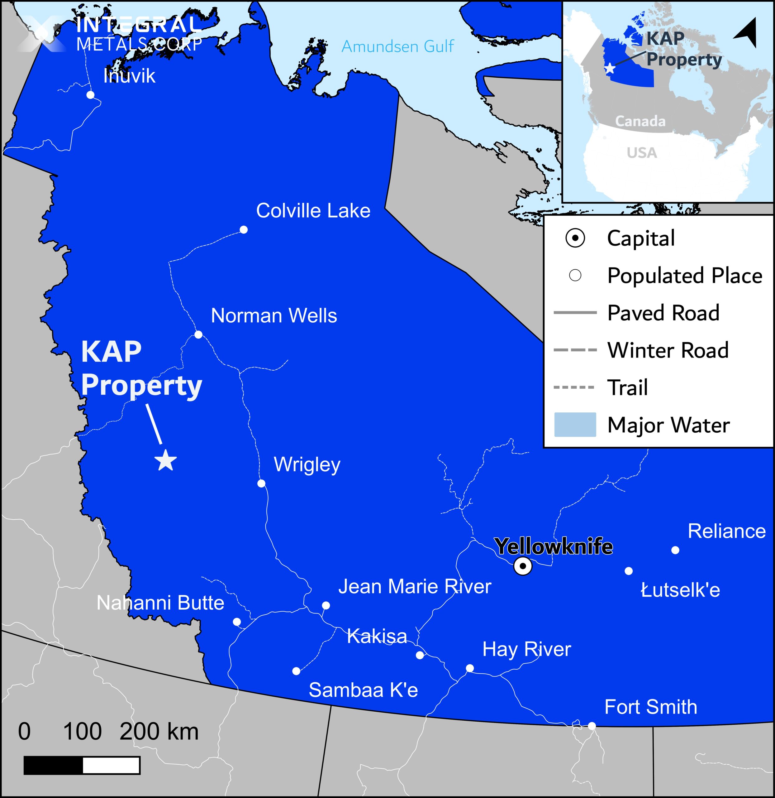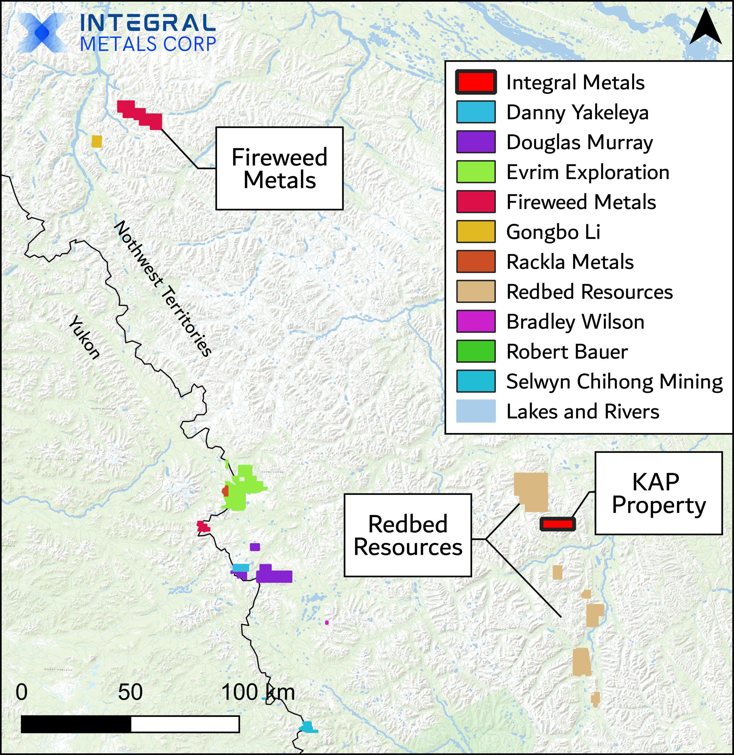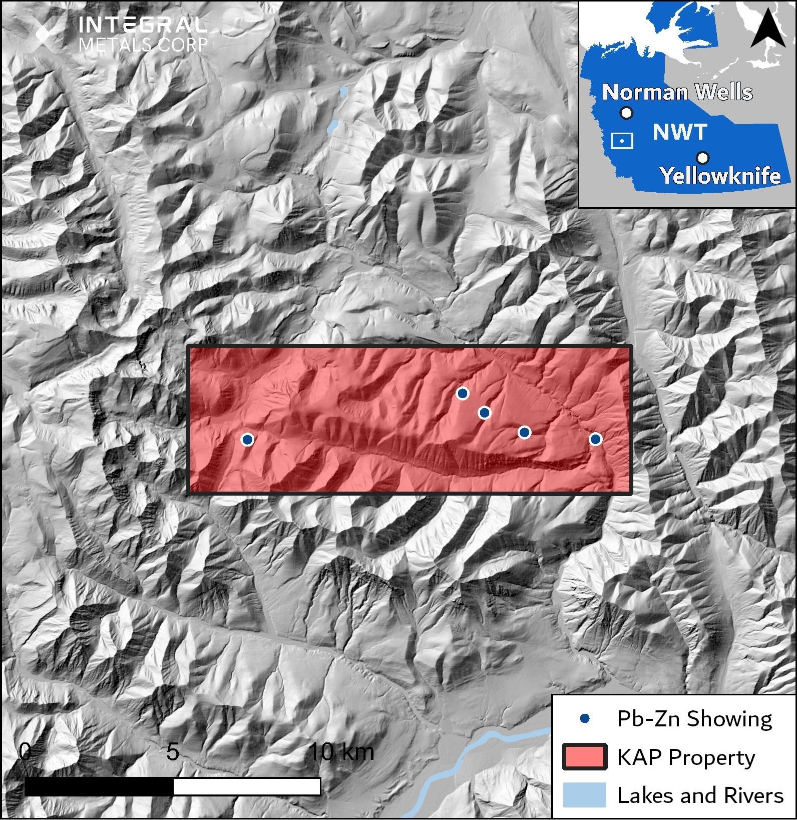 - The KAP Property is 100% owned by Integral Metals Corp., located in the Mackenzie Mountains, Northwest Territories, covering 7,500 hectares